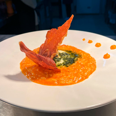 Rúcula, tomate confit, alho assado, crispy de presunto de parma e pesto de manjericão, acompanha pães da casa.