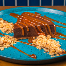 Torta densa de chocolate meio amargo, com caramelo salgado e biscoito crocante.